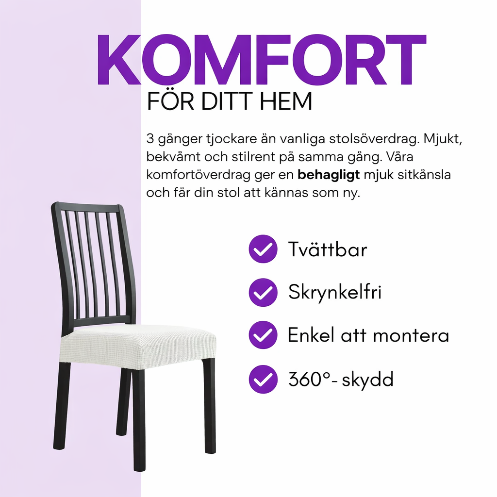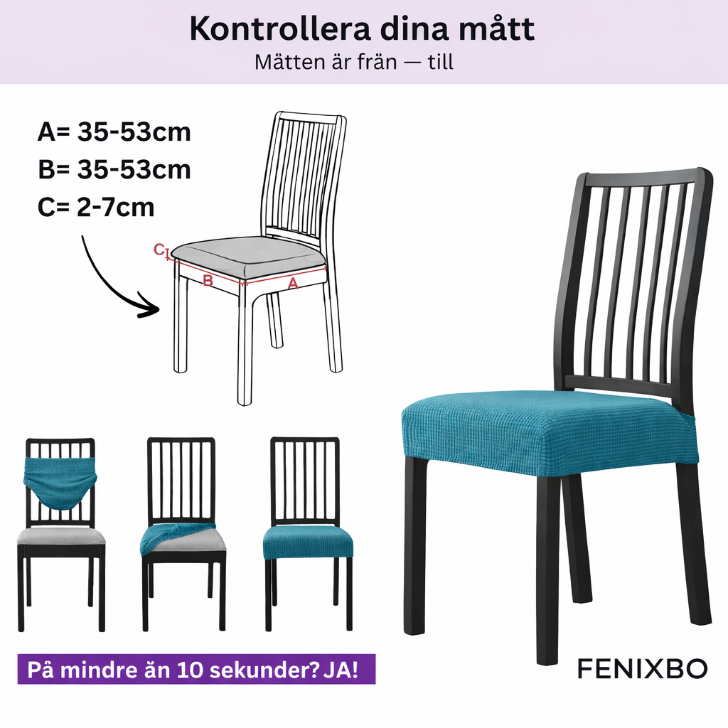 Det vattentäta, fläckavvisande tyget skyddar mot spill, olja och slitage och är lätt att rengöra och tvättas i maskin, och återfår snabbt sin ursprungliga form efter tvätt. Varje beställning innehåller 1 stolsöverdrag. Du får också en riskfri 14-dagars garanti och kundsupport via e-post: info@fenixbo.se
