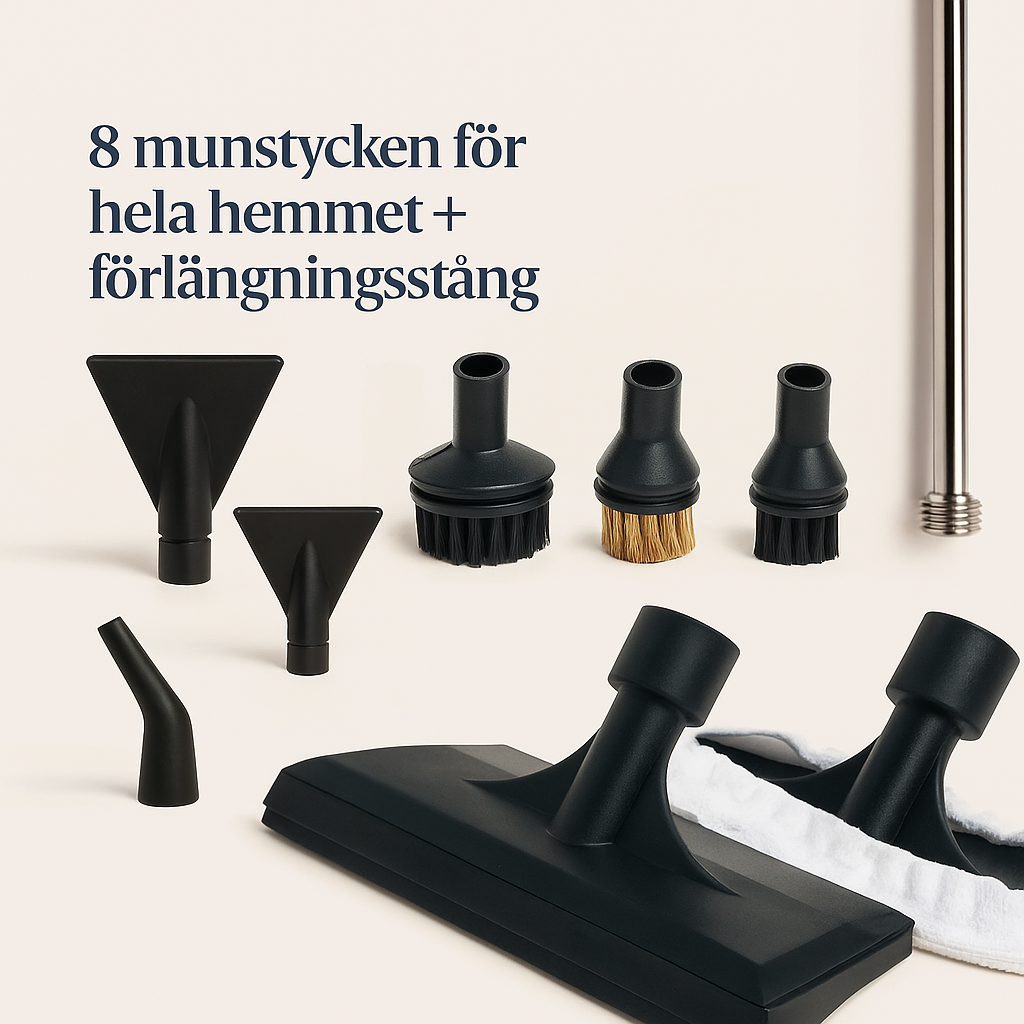 Tillbehör kan inkludera: böjd dysa, nylonborstar, kopparborste, skrapor, fogborste, glas-skrapa, mikrofiberöverdrag och rengöringsnål.