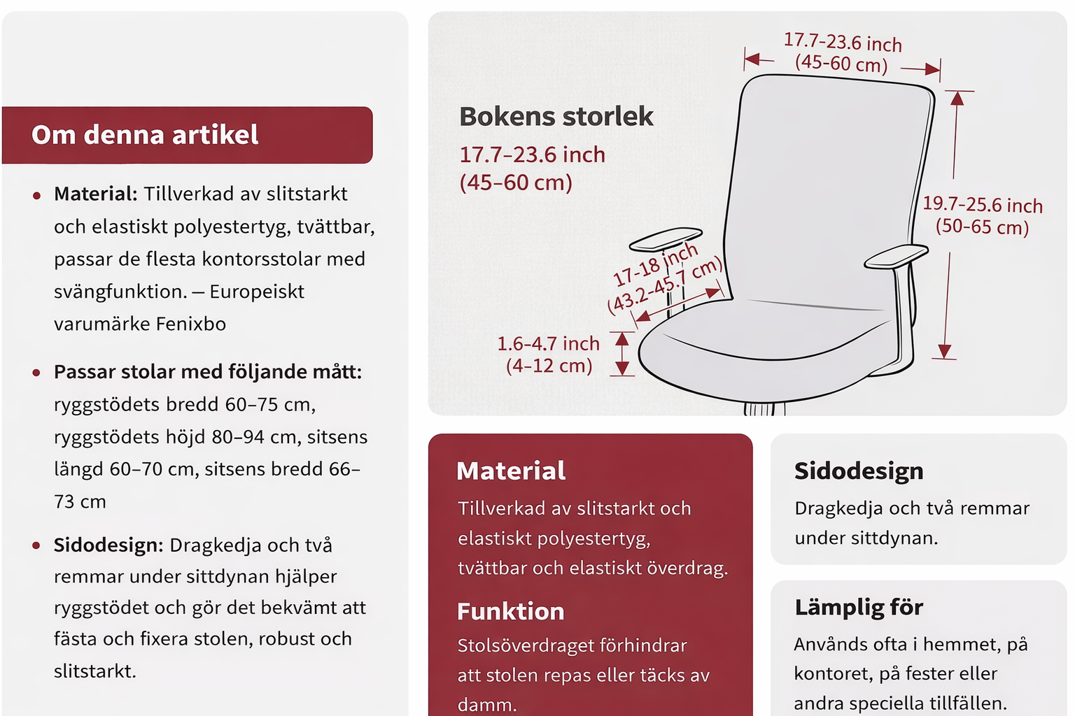 FENIXBO kontorsstolsöverdrag är ett snyggt och praktiskt överdrag från det europeiska märket FENIXBO som fräschar upp utseendet på din stol samtidigt som det skyddar den mot repor, slitage och damm. Det är tillverkat av mjuk, stretchig polyester och spandex, känns bekvämt, blir inte skrynkligt och behöver inte strykas. Sidoknäppningar gör det enkelt att sätta på och forma för en snygg passform, medan remmar under sitsen hjälper till att hålla det på plats utan att det glider eller förskjuts. Designat för att passa de flesta standardmässiga rektangulära kontorsstolar – inklusive snurrstolar och fåtöljer – och lätt att underhålla eftersom det är tvättbart i maskin.